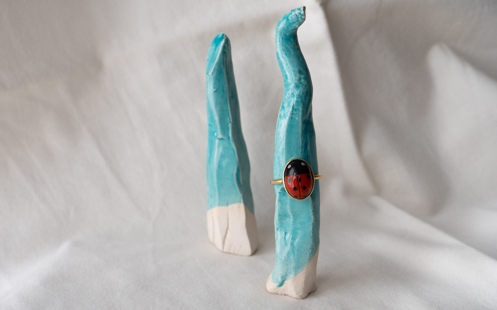 Lui è l’anello della fortuna: sopra al gambo in oro 18kt riposa dolcemente una coccinella, realizzata interamente a mano in corallo naturale. Ogni inserto, dagli occhi ai pallini, è anch’esso in corallo e inserito manualmente nel corpo della coccinella: non si pensi che siano dipinti! Chi più di lei è poi simbolo di buona sorte? Eh si, è proprio un anello fortunato!