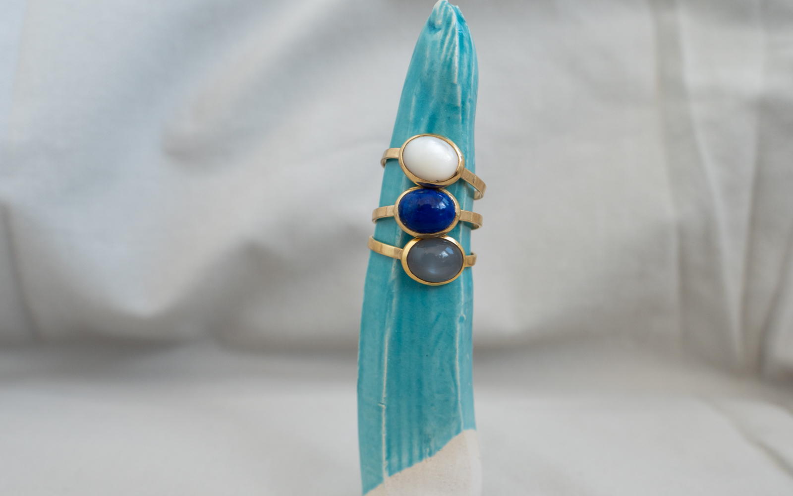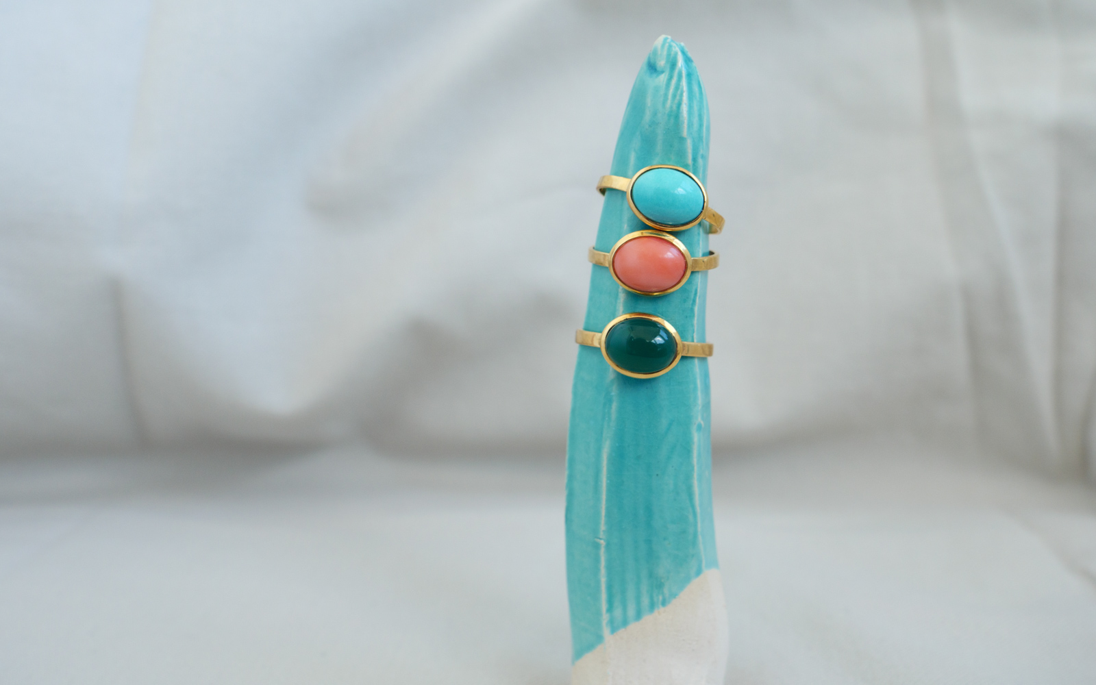 Lui arriva dal mare, dai ricordi d’estate. Colori pastello che si lasciano abbracciare da un castone d’oro, coralli naturali, turchesi e madreperla. Un mix di colori tenui e delicati che amano solo l’oro giallo.