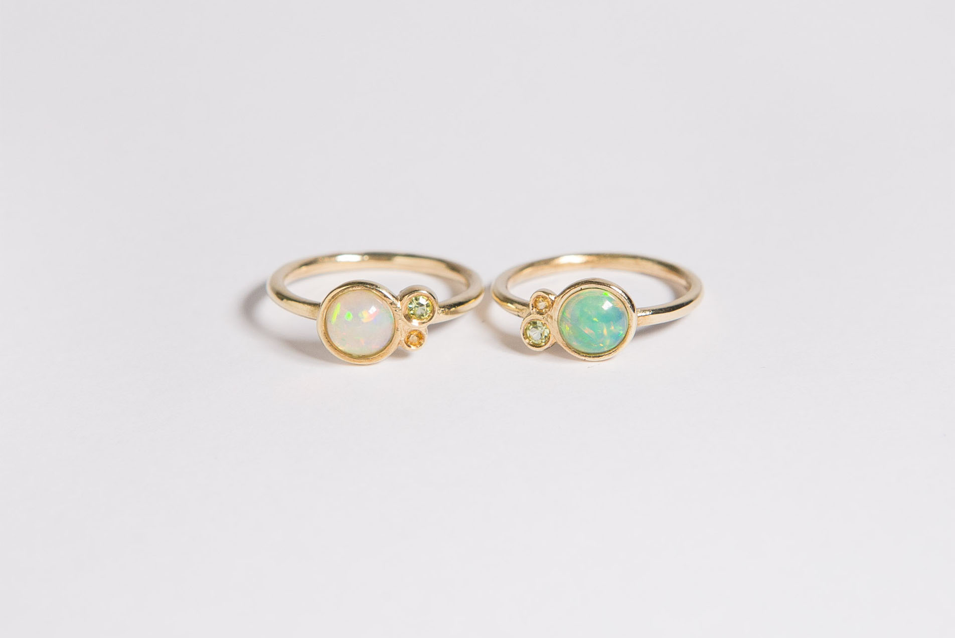 Piccola costellazione di pietrine semipreziose (peridoto e citrino) che ruotano intorno al loro pianeta, un opale etiope in versione scura e chiara.