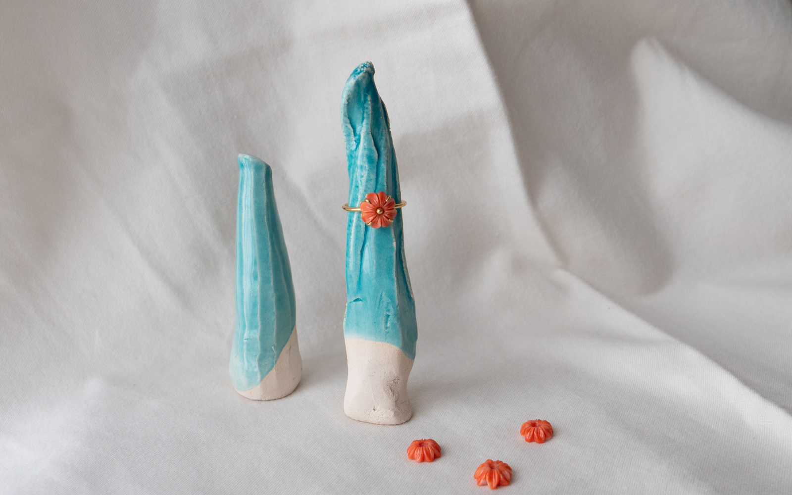 Questo anello nasce dal mio amore per il corallo, materiale vivo, intenso e prezioso dalla forma romantica del fiore, unito al calore dell’oro giallo.